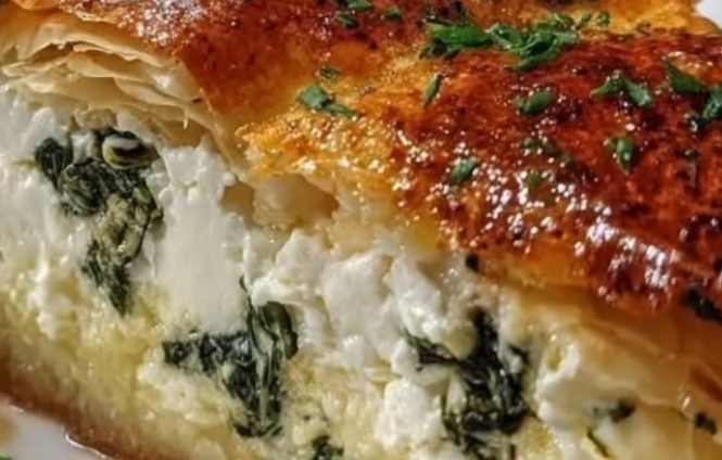 Spread the spinach-feta filling evenly over the layered phyllo.
