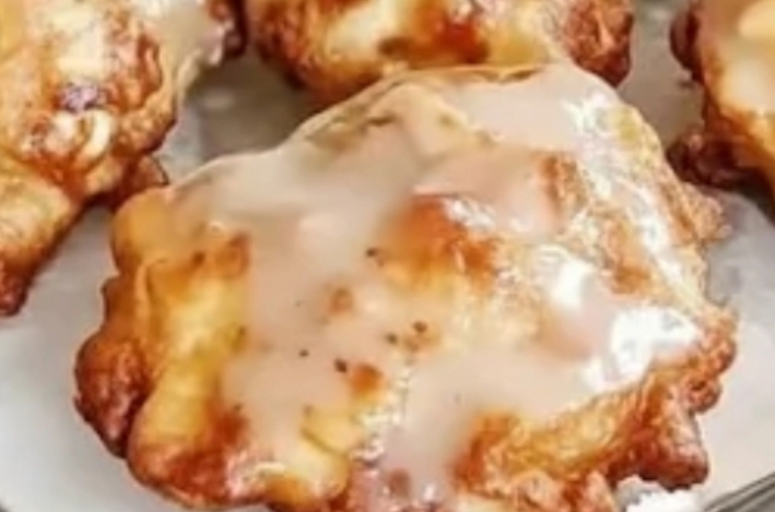 - While the fritters cool slightly, make the glaze. In a medium bowl, whisk the sifted confectioners’ sugar, 3 tablespoons of milk/cream, vanilla, and salt until smooth. Add more liquid, one teaspoon at a time, until you reach a thick but pourable consistency.