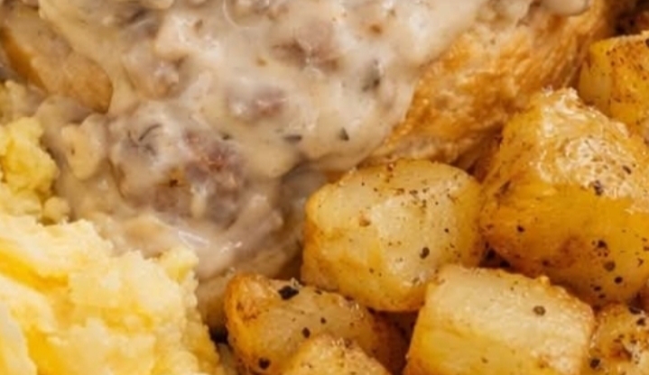 Split the warm biscuits and spoon the sausage gravy generously over the top.