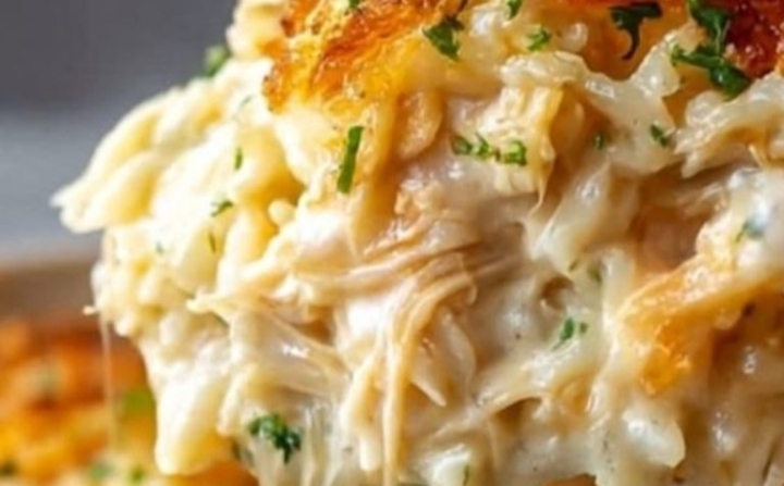 Creamy, cheesy, and loaded with French onion flavor—this easy chicken rice casserole is a cozy dinner winner every time!Ingredients:2 cups shredded cooked chicken2 cups cooked white rice1 can (10.5 oz) cream of chicken soup1 cup sour cream1 packet dry French onion soup mix1 ½ cups shredded mozzarella cheese1 ½ cups crispy fried onions (divided)Salt and pepper to tasteFresh parsley for garnish (optional)Instructions:Preheat oven to 350°F (175°C). Grease a 9×13-inch baking dish.In a large bowl, mix chicken, rice, cream of chicken soup, sour cream, French onion soup mix, mozzarella cheese, and 1 cup of crispy fried onions.Season with salt and pepper. Stir until well combined.Spread mixture evenly into the prepared baking dish.Top with the remaining ½ cup of crispy fried onions.Bake uncovered for 25–30 minutes or until bubbly and golden brown.Garnish with parsley and serve warm.