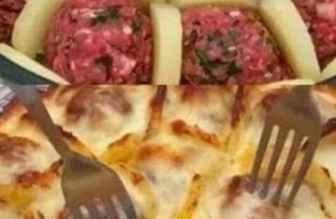 Use the remaining potato slices to separate the meatballs and form small portions.