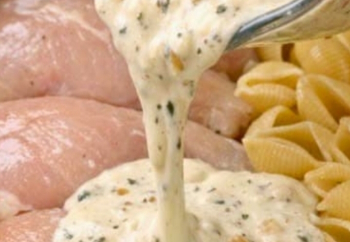 This is the antidote to weeknight exhaustion. Born from the wisdom of cooks who knew dinner shouldn’t demand a second job, this recipe transforms three humble layers—raw chicken, dry pasta, and a single pour of garlic-infused cream—into something that feels like grace. The shells plump gently in their own bath, absorbing every whisper of roasted garlic and herb. The chicken surrenders to tenderness, then shreds into silky strands that nestle into every curve of pasta. And that sauce? Not thin broth, not gloppy paste—but a velvety embrace that clings without weighing down. One pot. One pour. Dinner that loves you back.
